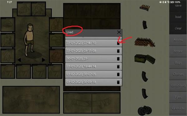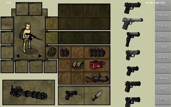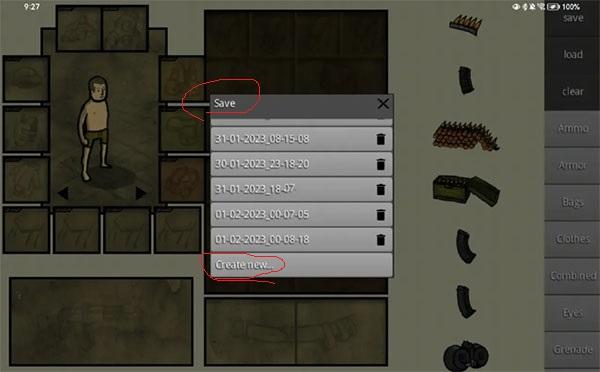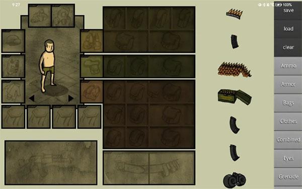 1.进入游戏首页,游戏开始后可点击右侧一列框中的任意一项(初save.land.clear)每一项为所对应的内容。例:bag为书包和军用背包,eye为夜视仪和战术护目镜。用手拖动至人物四周对应的方框内,如果对应方框错误则无法保留所选物品。注:暗色部分需放置背包等物品解锁贮存空间