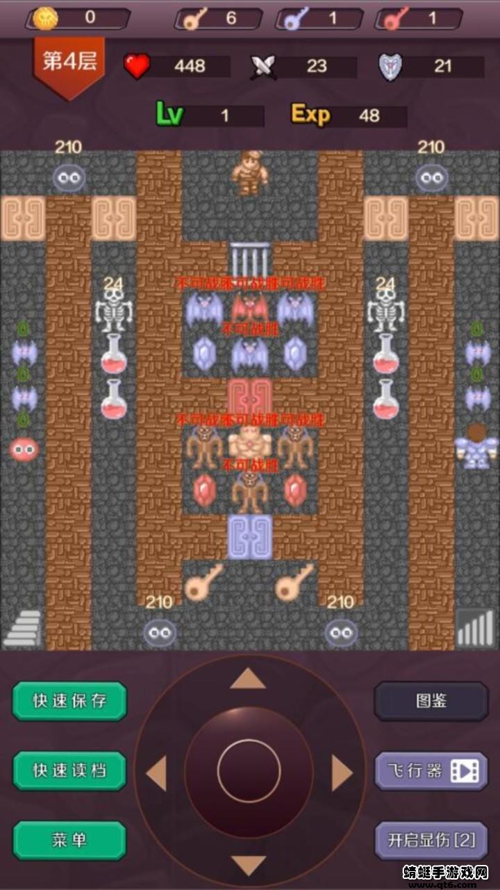 4.左下房间的小蝙蝠先不要动,因为现在还会伤血,直接杀到四楼,杀掉第一个小蝙蝠时,G刚好够,回去加防,这时小蝙蝠就不具威胁性了。