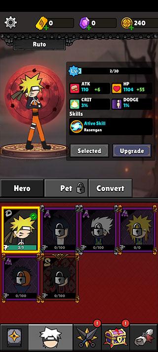 7.回到首页后,点击底部头像进入角色页面,上方【Upgrade】可以对角色进行升级,底部可以选择喜欢的忍者英雄和宠物技能。