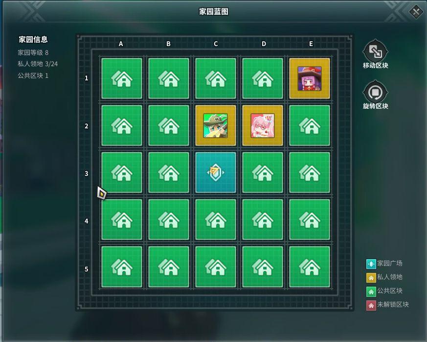 为了方便家园布置,本次版本更新后,家园主可打开家园蓝图,点击右上角进行旋转单个区块操作。