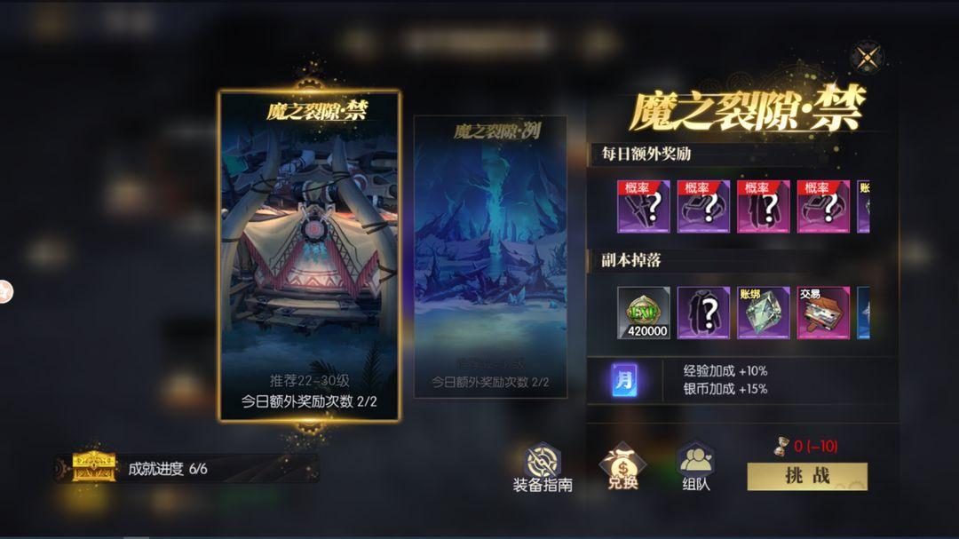 注意:魔之裂隙左下角有挑战成就可以完成,尽量按成就要求,可以获取大量技能点和强化点