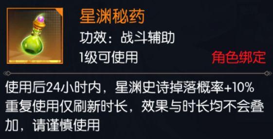 星渊秘药:使用后24小时内,星渊史诗掉落概率+10%(不推荐使用,50级后刷取更划算)