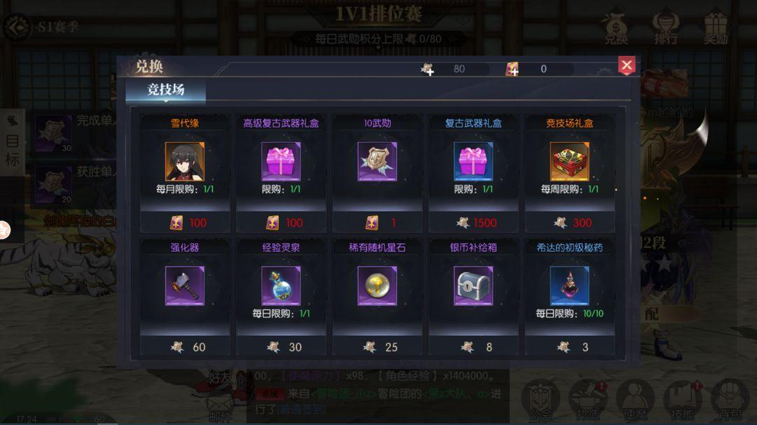 竞技场:竞技场商城可以兑换许多物品(使魔-雪代缘、高级复古武器礼盒、武勋*10、复古武器礼盒、竞技场礼盒、经验灵泉、稀有随机星石、强化器、银币补给箱)