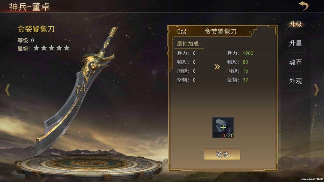 玩家给神兵升级可提升对应武将的属性,升星可提升属性、解锁专属技能和解锁外观,镶嵌魂石可提升属性,魂石强化到一定等级后可激活魂石特性、解锁强力技能