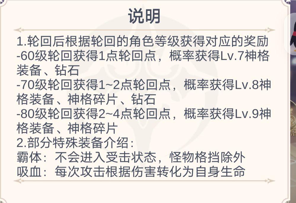 角色60级时在主城开放轮回,轮回有概率出整件神格装备,70级,80级轮回出神格碎片,可以在神格商店兑换神格装备。
