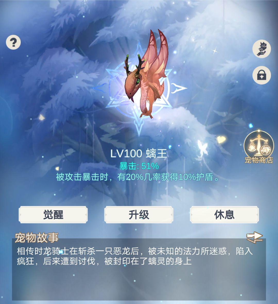 开荒期推荐培养3只100级紫宠螭王,用来提供高额暴击率,预计花费240万宠物经验丹。