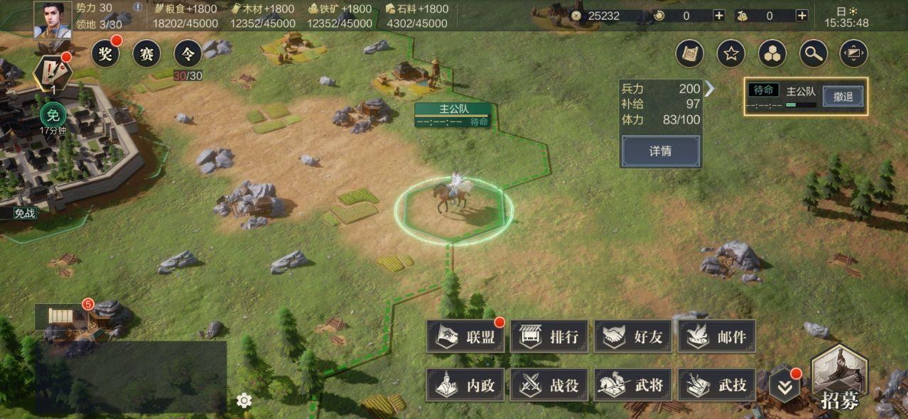 铜币、木材、铁矿、石料等资源多由不同等级地块产出,主公需要根据战力占领尽多的地块生产资源。