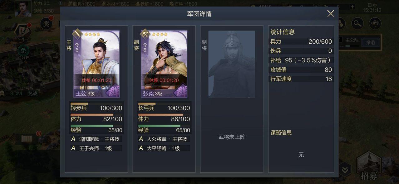 此时该军团在休整结束前不可攻占其它资源地块,但可以返回大营。军团位于大营中时,可以在配置界面快速分配兵力和调整阵容等,而预备兵源需要在城建中的征兵中花费资源获取,在征召期间会源源不断地获取兵源。