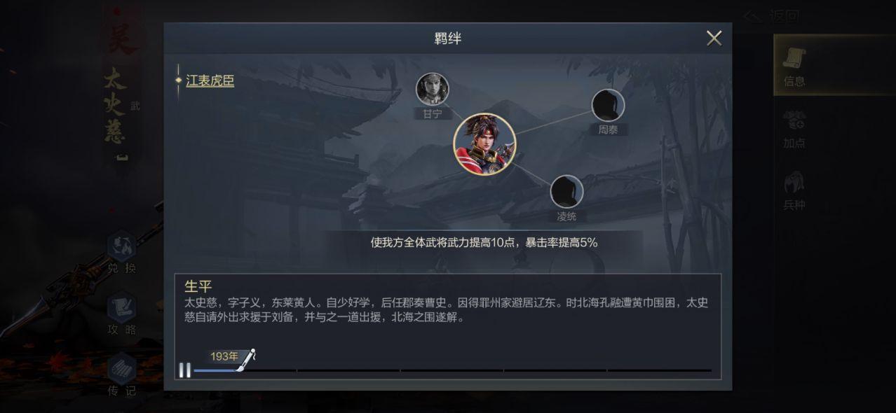 传记界面中玩家可以看到当前武将的人物羁绊效果和生平史实。