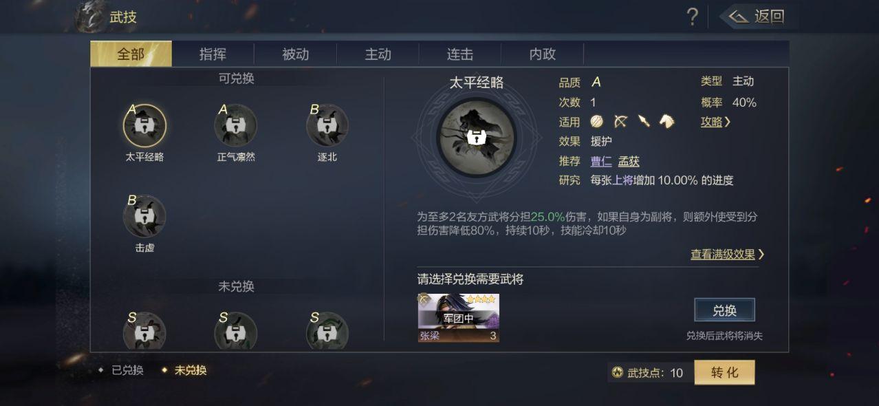 兑换按钮可以帮助玩家消耗当前武将获取相应武技;