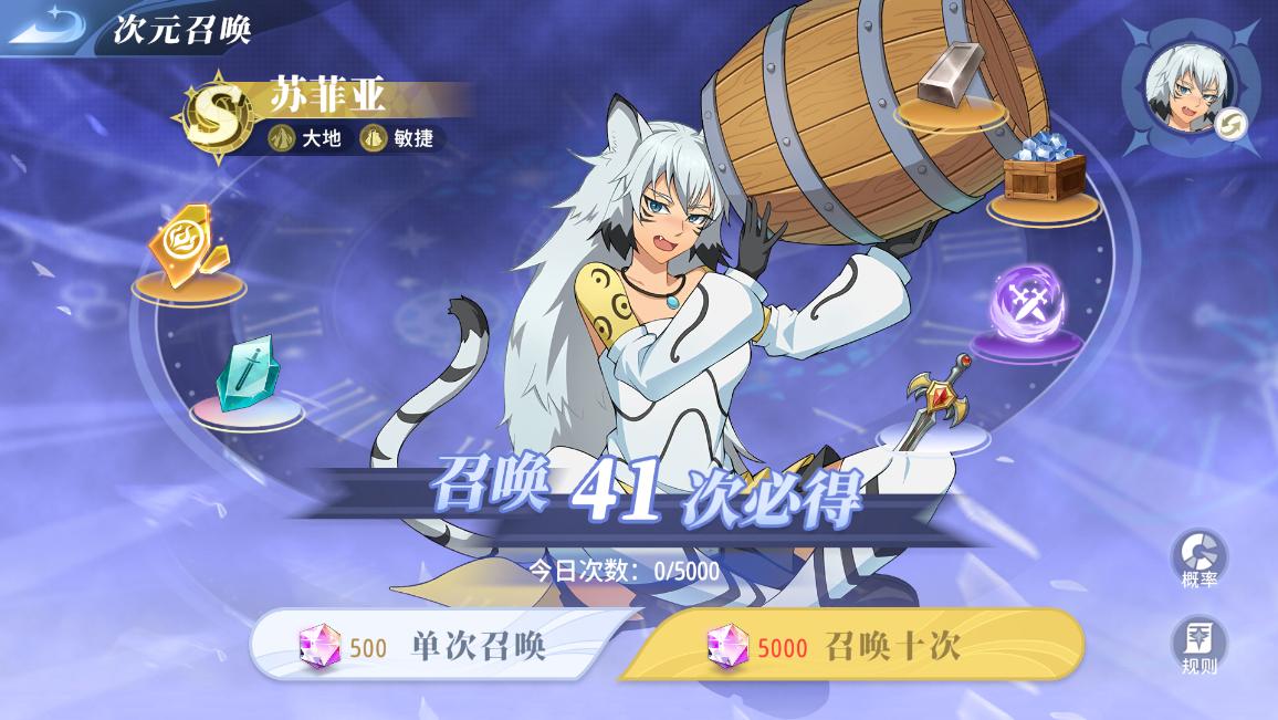 E. 次元召唤。消耗钻石,可以从五大元素中选择任意s级伙伴,指定次数内必出该伙伴。除了能抽到强力伙伴,还能获得大量珍贵材料。