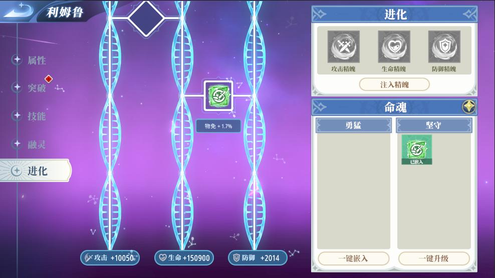 进化:可通过注入攻击、生命、防御精魄为利姆鲁提升攻防血三维属性。进化进度达到某些节点后,可解锁命魂槽位。