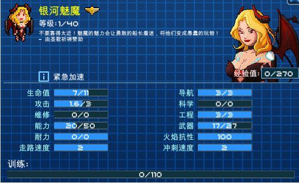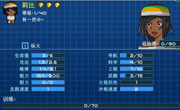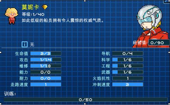一个船员有着10条属性,左侧属性分别是血量 攻击 维修 能力 耐力 右侧属性为导航 科学 引擎 武器 火炕 。血量攻击很好理解,血量归零,船员死亡,攻击力就是船员在遭遇敌方角色时一次攻击所造成的的伤害,维修就是船员在房间血量未满时一次修理后给房间修复的血量,能力有着多种情况(当船员的技能为刺杀或者毒气时能力就是造成伤害的具体数值,当船员的技能为紧急加速时能力数值为房间加载速度的具体比例(100为直接加载一次房间)速度是船员的基本属性(无法通过训练改变),区别于跑步和走路,如果走路与跑步速度是1/3 那么在船员还有耐力时,他的速度是3 无耐力时,速度为1 也有走路与跑步速度是3/3的船员,那么耐力对其没有作用,例如银河精灵
