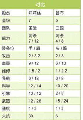 (各个星级的船员其实属性差距并不算特别巨大,即使是七星的莉莉丝比起五星的吕布也仅仅是各方面数值的小提升,但是在训练上七星训练值上限是110点,五星只有90点,所以七星通常情况下远远强于五星,但是在前期资源缺乏的情况下,养出一船五星保持战力也是不错的选择)