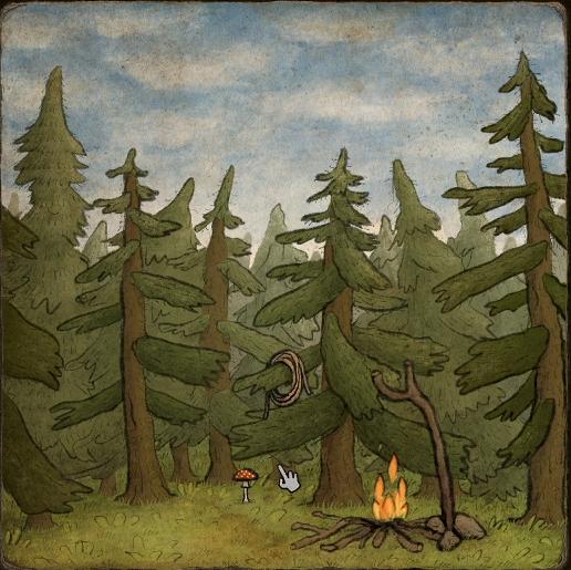 惡魔住在山洞裡,我們拿硬幣或橡果、蘑菇隨便一個什麼東西扔一下他就會出來,我們答應他把神父從教堂綁走,幫他找一根繩子,於是他就成了我們的同伴,而繩子在如下圖所示的地方,這裡有一朵紅蘑菇,我們也可以順手採摘。