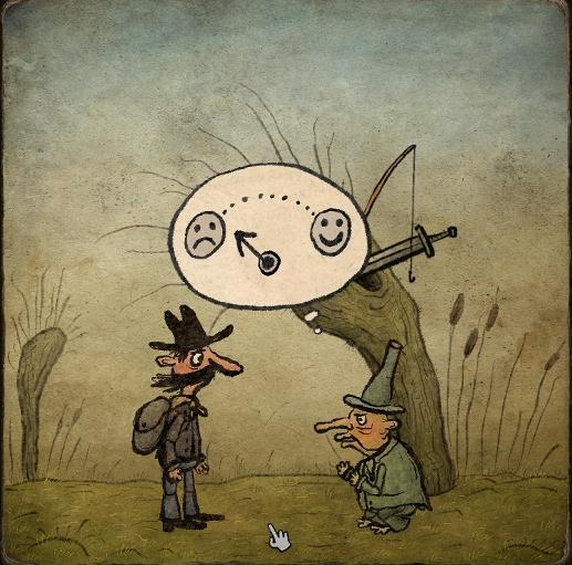 來到一個愁眉苦臉的商人這裡,他告訴我們,想要魚竿,就得逗他開心,拿兩個道具成功逗他開心,就會給我們魚竿。