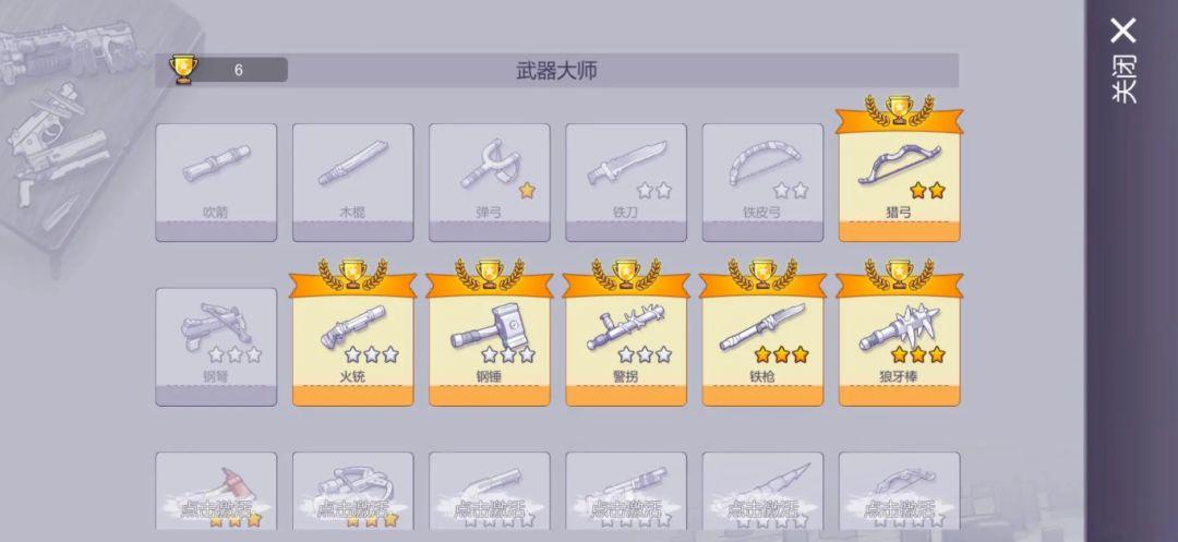 1、收集成就类型:共包含武器、食物、钓鱼、击杀四种类型的收集成就。2、金杯奖励:收集成就达成获得金杯,金杯累积一定数量可以获得奖励【武器成就】获得对应武器,即达成金杯收集