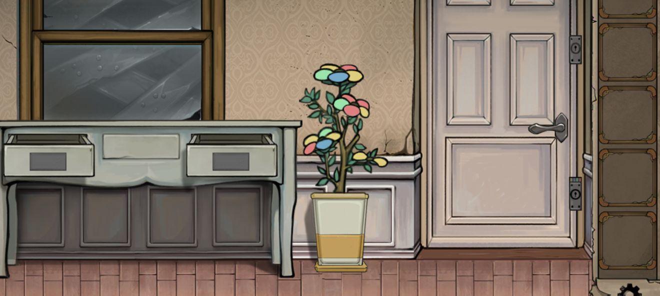 使用【椅子】将衣柜上面的【水壶】取下,拿起水壶浇花。花盆里将会开出花朵。