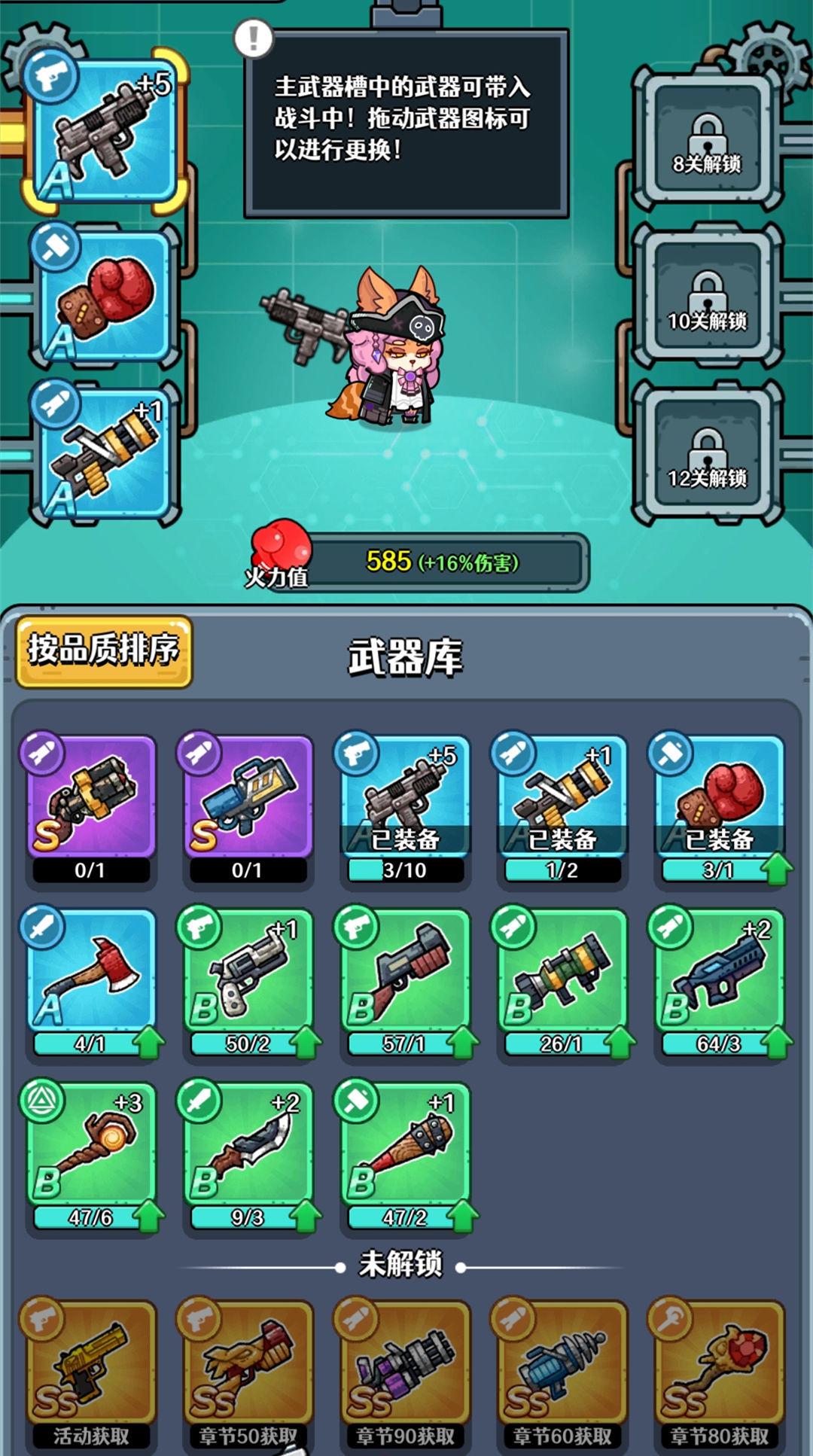 主武器槽中的武器可带入战斗中,而佩戴副武器则可以提高战斗内刷新的概率,除此之外,佩戴武器也可以增加火力值,让战斗更加轻松哦!