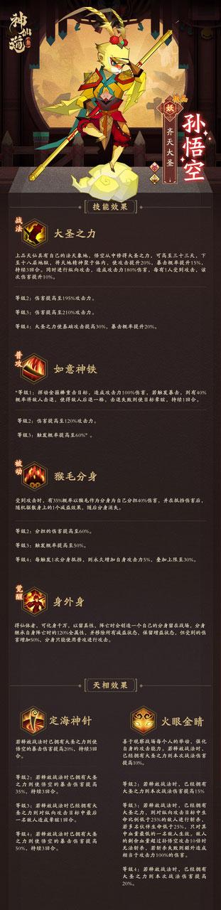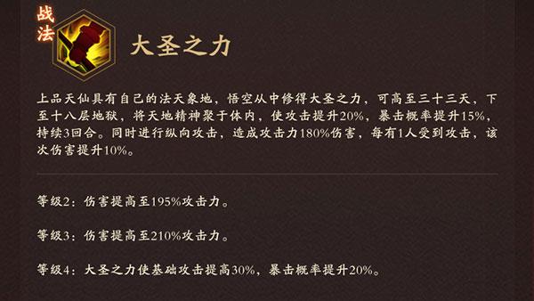 上品天仙具有自己的法天象地,然而孙悟空三年修炼就有了常人千百年的内功,直接从中修得大圣之力,可高至三十三天,下至十八层地狱,将天地精神聚于体内。技能类型结合了这一专属神力,使该技能效果为攻击时会有伤害加持。