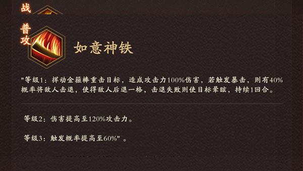 如意金箍棒是孙悟空所使用的兵器,两头由两个金色金属片框住,中间是一段乌铁,有星斗铺陈,孙悟空将其调整为最适合自己的丈二长短,平时则缩成绣花针藏在耳内。因此孙悟空的普攻技能设计便结合了这一专属兵器,其效果为击退敌人,打乱阵型,即使击退失败,还可以造成敌人眩晕。