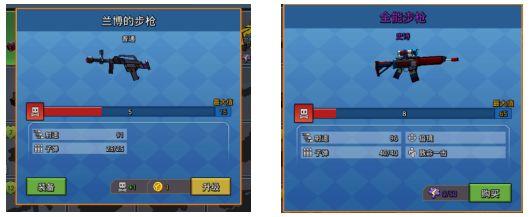 在此区域显示玩家当前身上所预览的武器装备效果。装备属性信息,在此区域显示玩家当前选中的装备信息详情,如武器的伤害效果等。购买/升级按钮,选中未购买的武器时,该按钮显示为购买按钮。选中已购买的武器时,该按钮显示为升级按钮,点击升级/购买按钮则自动打开武器升级/购买界面,点击任意空白位置关闭该界面。
