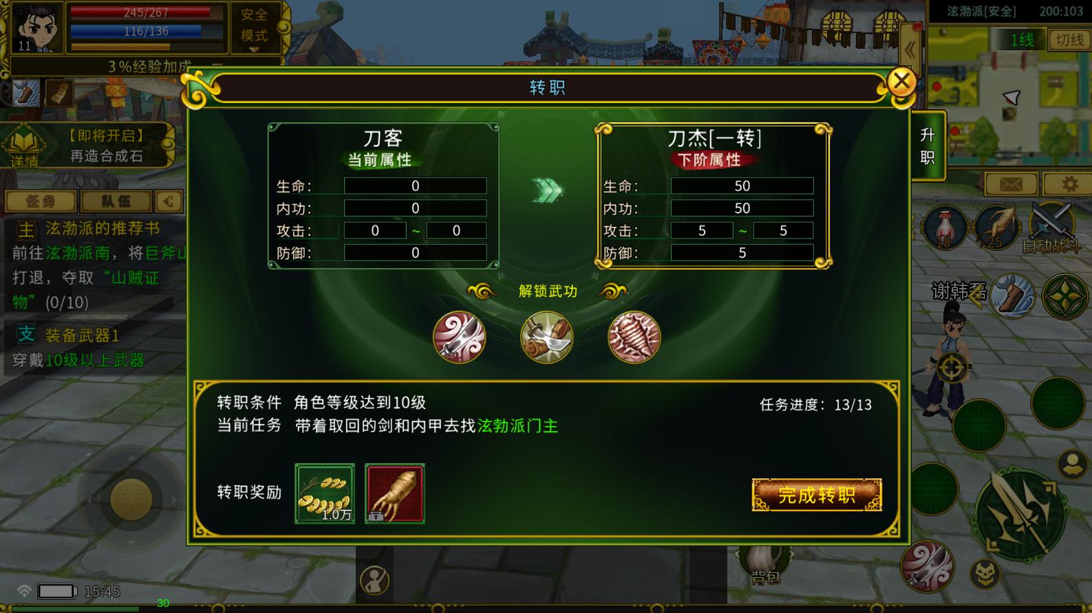 江湖是自由与潇洒的。在你完成了一些苛刻的条件后,你就可以选择是成为百步穿杨的神射手,还是不死不休的枪客…大侠在达到11级后可开启转职功能,可提升角色属性。