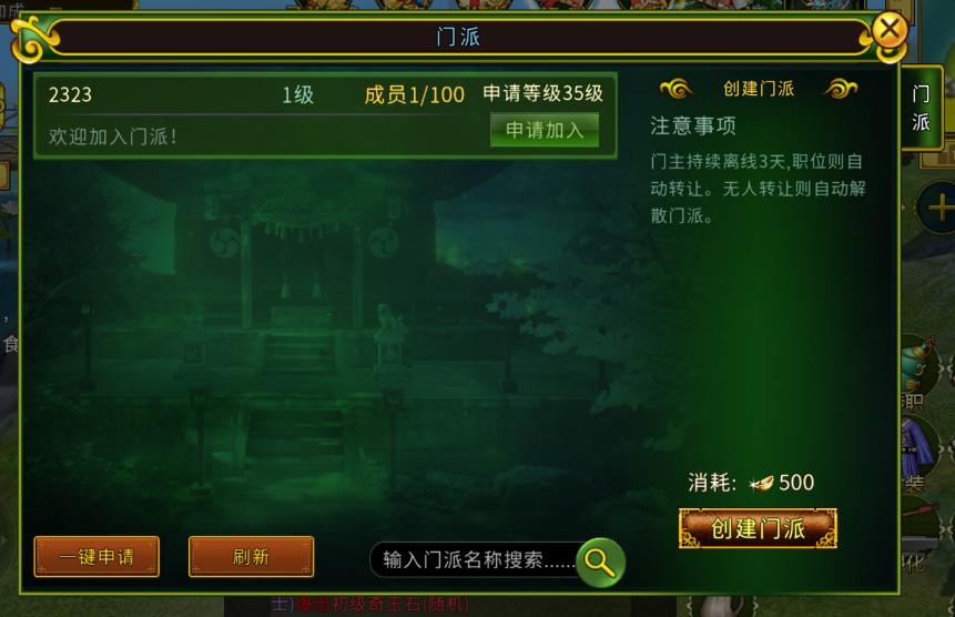 在江湖,结识志同道合的各路侠客。门派能为每一位身在门派的大侠提供一个快速成长的平台,也是归属和家园。大侠在达到35级后可开启门派功能。