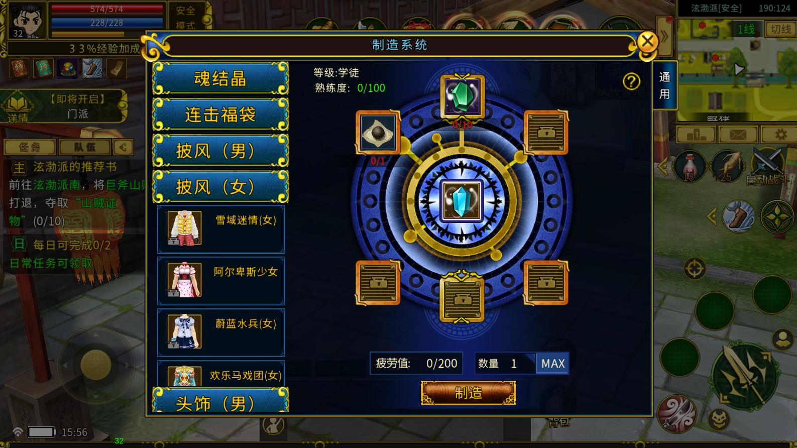 在江湖,以一把神器即能问鼎天下。你可以打极品神器,实现十步杀一人,千里不留行。大侠在达到32级后可选择锻造、裁缝、火工,学习不同的制造技能制造对应的道具。