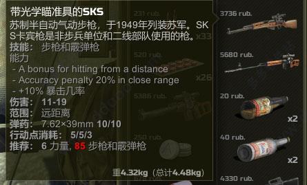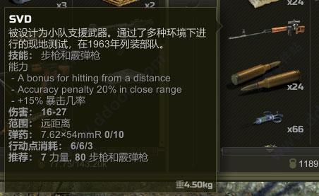 带瞄准镜的SKS,轻狙,SKS的改装枪,这把游戏唯一的枪在柳德米拉手里,也就是三雇佣兵里的女狙击手。除了伤害之外,同SVD一样,而极其优异的精准射击5ap,和廉价量多的7.62x39mm子弹,再加上简单的获得方式,导致这是主角手里最实用的狙击枪。伤害没大狙高,暴击也有100+,一回合两次都没暴击的情况还是比较少的,可以适当洗洗脸。火车站剧情中如果主角不去帮忙,通常情况下是另外两个雇佣兵战死,柳德米拉干翻全场or三人全灭,侧面就表现出了这把枪多强,战斗结束三雇佣兵中活着的会把另外两个人尸体带走,想获得这把枪的唯一途径就是让三人全灭,有时候柳德米拉人品爆发,可能需要主角跳反补刀。同样的这也是一把在队友手中发挥不出实力的枪,不过主角不用的话,这把枪给队友可以省子弹,毕竟狙击枪不容易误伤。