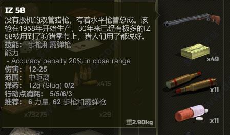 推荐枪械:IZ-58.这把枪十分的强,散弹枪只有这一把拿得出手,然而实际使用上,他比机枪还要强。散弹只有用pellets子弹才能打出伤害,不讨论slug。pellet子弹打出6次伤害,和机枪轻扫一样,但是有伤害减益,不过IZ58的基础伤害十分之高。IZ58有着机枪的射程,机枪的命中率,机枪的伤害,但是一回合能打两枪,硬伤是弹夹,只有2发,换弹消耗3ap。不过实际使用上,你会发现iz58没有任何缺点,因为IZ58是和机枪混用的。第一回合两发IZ58,第二回合装弹+一发RPK-74。IZ58伤害高的另一个原因是,他的瞄准射击用5AP,是可以打头的,一回合2枪的同时,可以享受步枪瞄准暴击双倍的perk,而pellet子弹是一发子弹6次伤害,每次伤害计算暴击率,但是一旦发生暴击,那么后面的伤害就全部是暴击。这就导致了IZ58的实际输出远高于RPK,而武器价格只有1/5,子弹价格1/2,技能点数只需要62,而且他是步枪打出机枪伤害,所以可以不点自动武器和狙击混用。遗憾的是这把枪在队友的手里完全发挥不出实力。