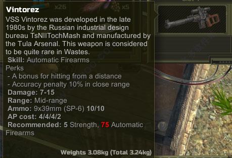 带瞄准镜的VSS,自动狙,VSS的改装枪,这把游戏唯一的枪在咆哮森林不知名士兵的手里,有一圈蘑菇的谷地,入口用树枝遮掩,但是有上帝视角的主角一眼就看穿了。生存模式获得这把枪有一定难度,非生存模式可以SL击倒然后刀子处决,生存模式带着柳德米拉的枪也能在前期得到这把枪,毕竟射程优势。4AP的精准射击,享受瞄准镜加成不过射程是中,同样暴击伤害100+,但是子弹很稀少,而且基地不能做,主要来源是K城军火商和野外军火商,虽然自带扫射,但是还是不要想了。值得一提的是这是带瞄准镜的突击步枪,扫射享受瞄准镜+暴击,而且是自动武器,配机枪的话,可以不点步枪技能。4AP的精准射击,让他成为泛用性最高的武器,它几乎可以和任何武器混用,好用的武器技能通常都是6AP,比如机枪和大狙。这把枪在队友手里也能显著发挥实力,但是子弹肯定hold不住,所以还是留在主角手里比较好