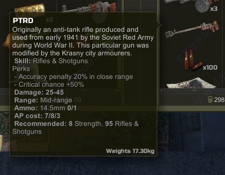 PTRD,反器材狙击枪,伤害量巨大,迷之暴击加成,迷之中距离可能是没装瞄准镜的关系,不享受瞄准镜+暴击。几乎都是一击必杀,受限于稀少的子弹数量,生存模式打boss时队友的首选。普射7AP精准射击8AP,这就导致了这把枪是队友的神枪,主角的收藏品。
