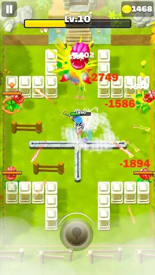 3、玩法很简单,左下角控制角色的移动,右下角则是弓箭和标准轮盘,要合理运用。