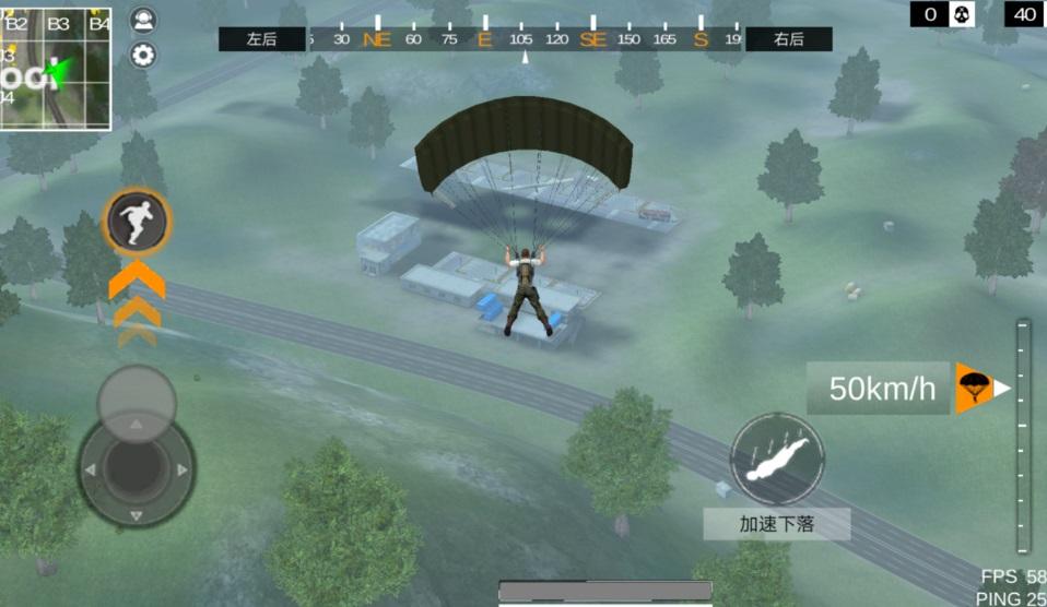 1.进入游戏后,会在一架飞机上,当到达自己想要落下的位置时,点击屏幕右边的按钮,会跳下飞机,跳下飞机后,可使用左边轮盘“向上”按钮进行极速下降,可使用“左、右”按钮进行左右移动;也可以划动屏幕观察周围环境。