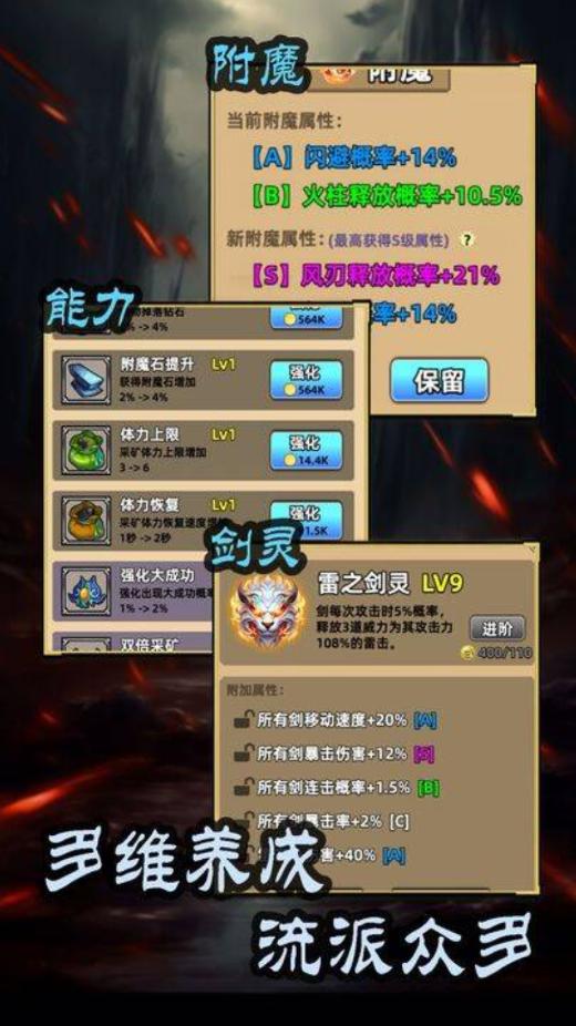 属性流派系统:通过附魔、剑灵、强化等多种系统,玩家可以为神剑附加不同的属性,如暴击流、技能流、攻速流、闪避流等,探索自己的专属流派。