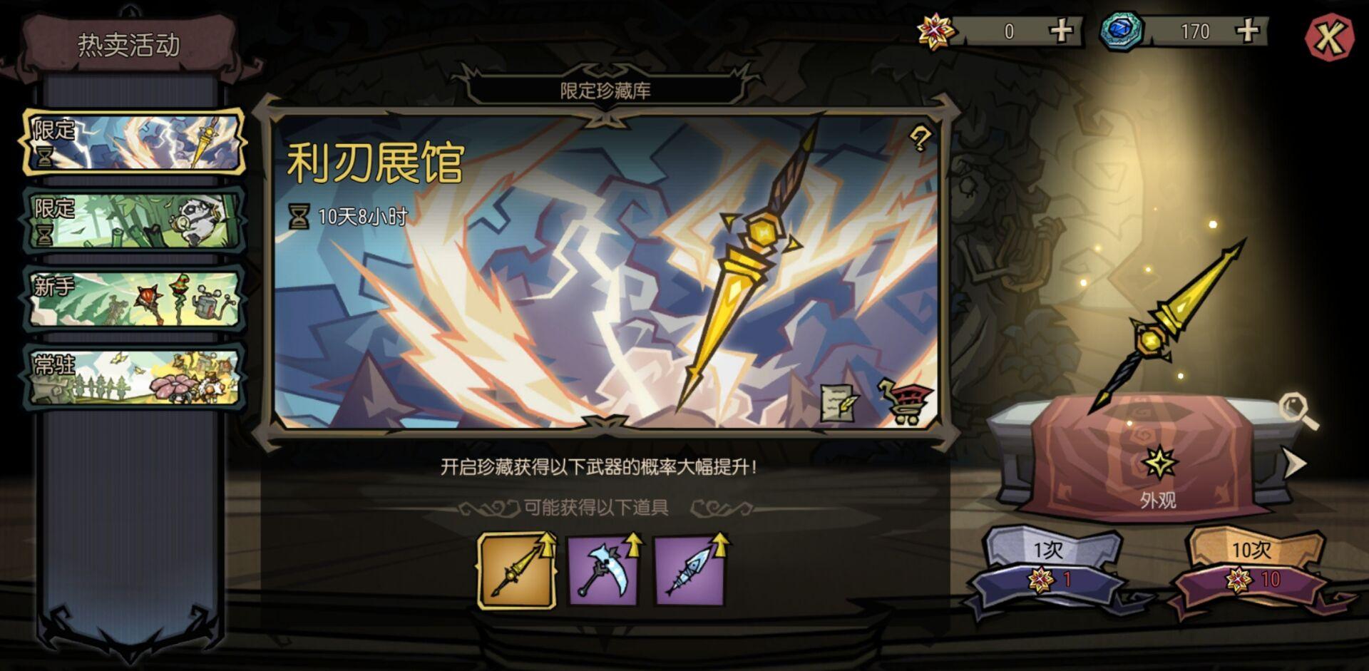 热卖活动可以理解成武器卡池,分为常驻、新手和限定,可以获得传说武器,通过获得强力武器和战宠,到后期突出个神挡杀神,另外活动重复武器将变成对应武器图纸,图纸可以升级武器星级,获得更强大的效果