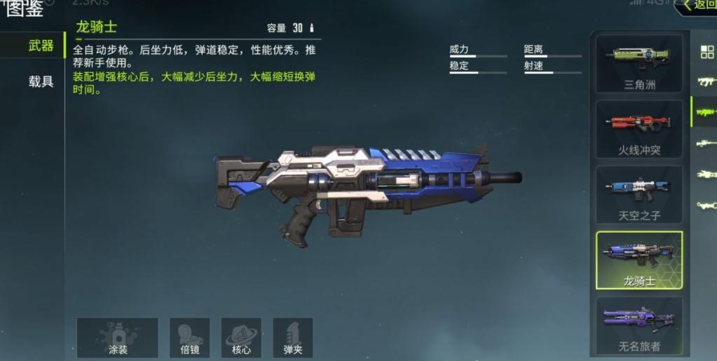 龙骑士:全自动步枪,后坐力低,弹道稳定,性能优秀,推荐新手使用,装配核心之后,可以大幅度减少换弹时间和降低开火后坐力。稳定性比较好。