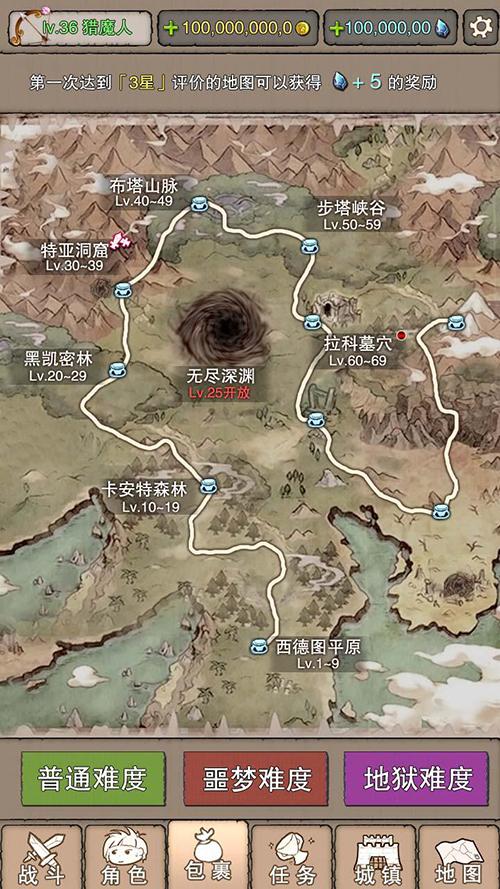 作为游戏的核心,世界地图中有着诸多平原、森林、山脉、峡谷等关卡,每个关卡中又分为五个小章节副本,冒险家只有在章节副本挑战结束后的评分达到2星以上才可以进入下一个章节副本。玩家可以在关卡地图上收获各种装备、经验和金币。