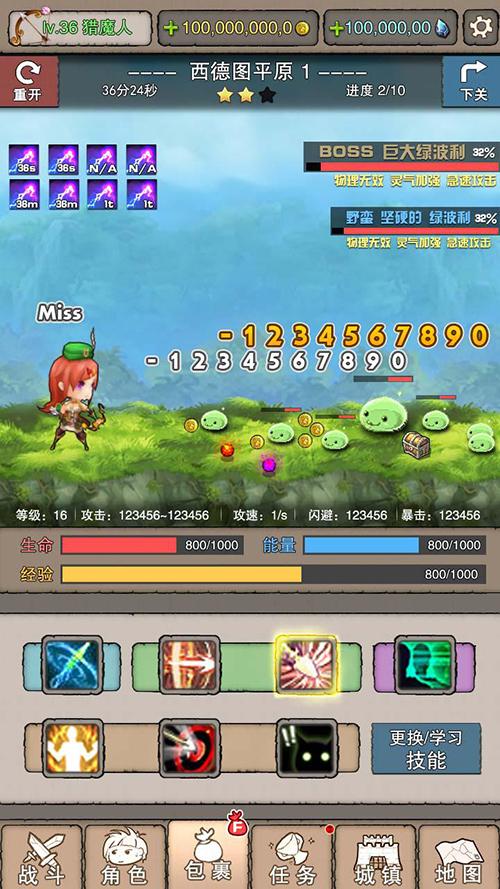 在战斗界面的上方是玩家的金币和钻石,中间就是华丽的战斗界面,战斗界面的下方可以看到玩家的攻击,攻速,闪避和暴击值!