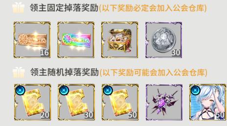 6、公会仓库奖励:若成功作战击杀BOSS则会获得公会仓库奖励,这部分奖励物品不会直接放入玩家的背包,而是放入公会仓库中成为可供玩家兑换的商品。公会仓库奖励分为固定掉落奖励和随机掉落奖励,固定掉落奖励为必定掉落,随机掉落奖励为从奖励池中随机抽取1件物品掉落;