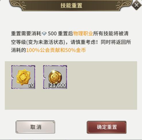3、可重置指定公会技能,重置后该职业技能等级清空,同时返还所消耗的50%金币和100%公会贡献。技能总等级越高重置消耗的钻石越高首次重置只需消耗300钻石;
