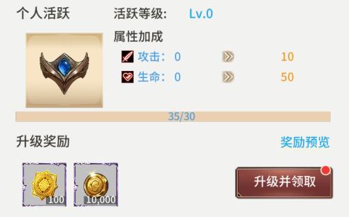 2、当获得的活跃点可用来进行升级,每级都可获得公会积分和金币,活跃等级越高属性加成越高;