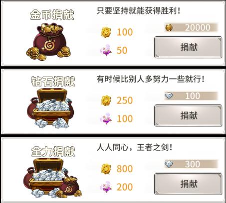 1、任何公会成员每天只可捐献1次,从3种捐献中选择,不同捐献项带来的收益不一样;
