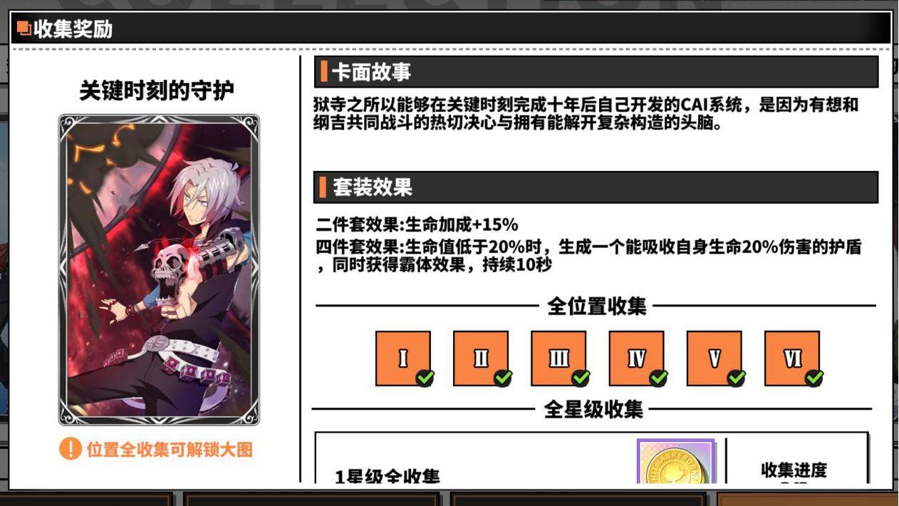 关键时刻的守护四件套效果是生命值低于一定值给自身加护盾和霸体状态,主要用于pvp,适合的角色有笹川了平、XANXUS、泽田纲吉?未来篇这种耐打的角色,不建议脆皮角色用。