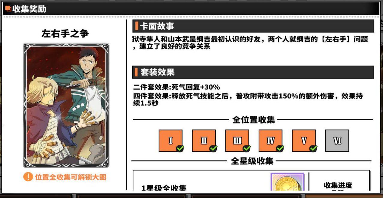 左右手之争的四件套效果是在释放死气技能之后给普通攻击一个短暂时间的增伤,这套卡比较适合那些普通攻击缺乏额外伤害加成的角色,比如:山本武?戒指篇、狱寺隼人?戒指篇(当前狱寺的普攻似乎存在bug)、云雀恭弥?十年后。这套卡可以用在pvp也可以用在pve,主要作用就是在死气技能释放后短时间增强普攻伤害,保证持续高伤害。