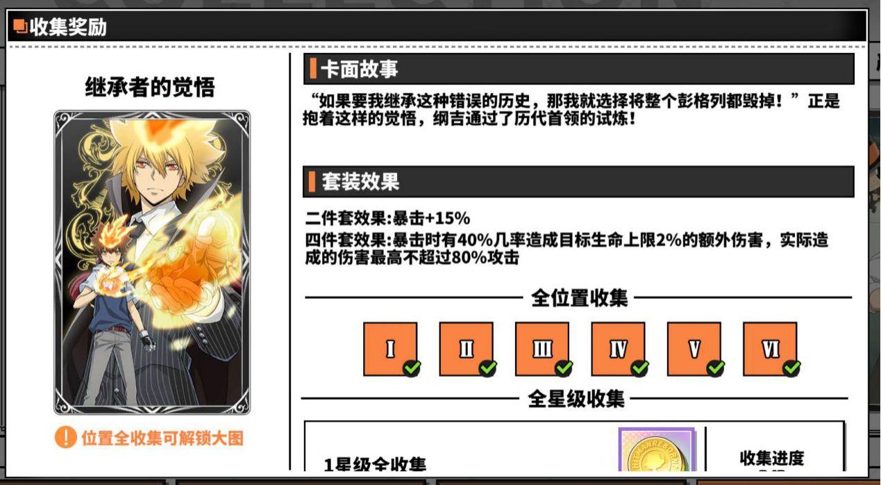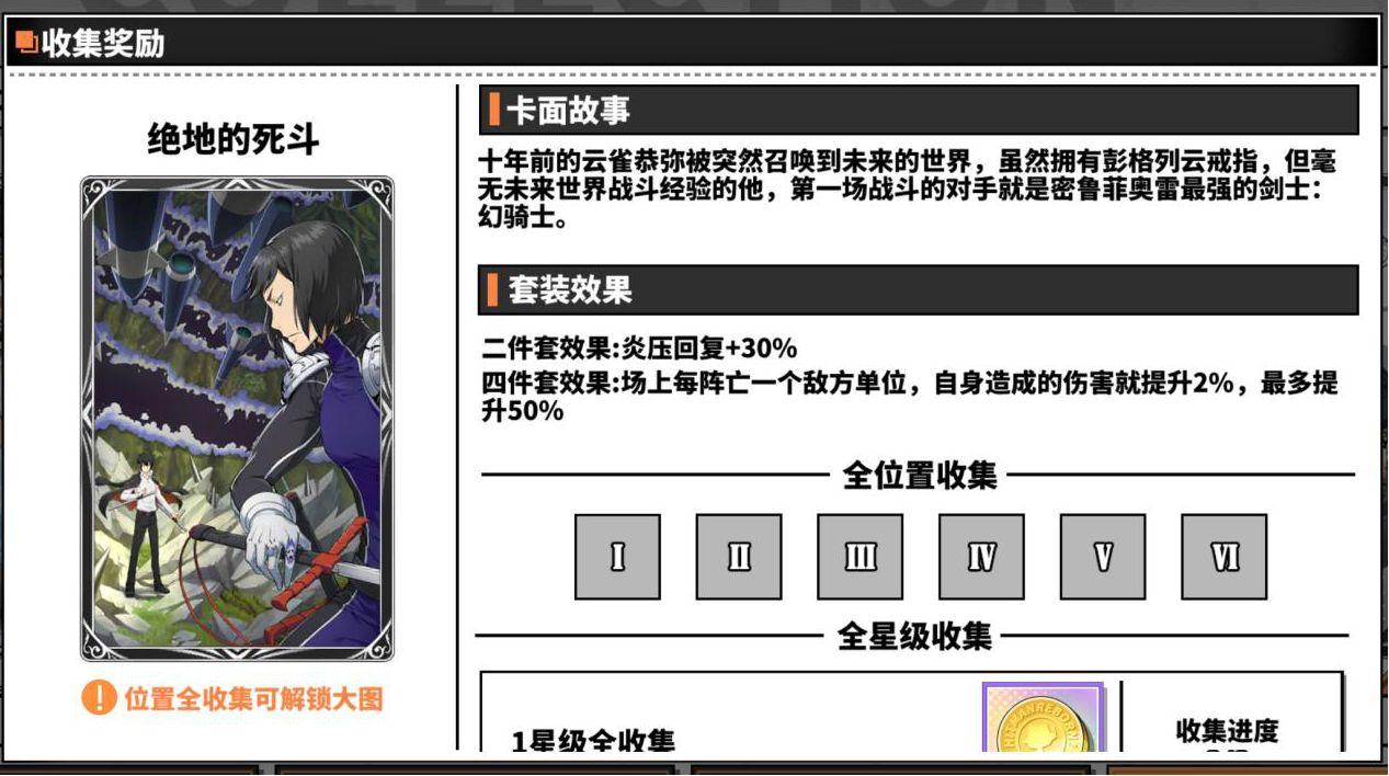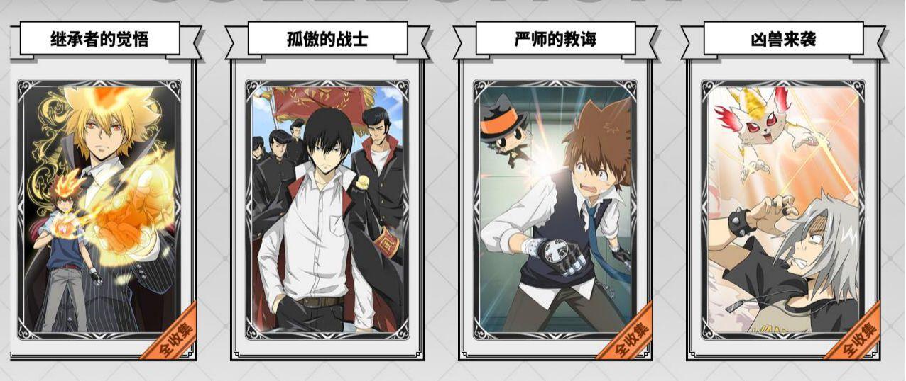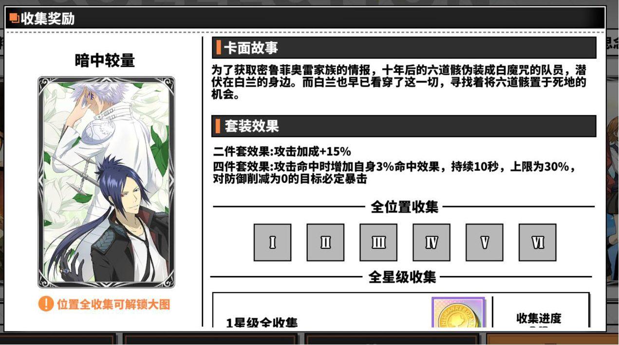 另外在成就任务中完成一定次数的究极模拟战和初级模拟战也可以领到卡片碎片或者卡片结晶,如果有拉尔?米尔齐、幻骑士、六道骸、云雀恭弥?戒指篇(需要五星),可以去卡片屋用卡片结晶换一套暗中较量(用来越级挑战斯帕纳初级模拟战,优先换一三五号位,二号位主属性需要为攻击,四号位需要为命中,六号位主属性需要暴击伤害,如果得不到四号位主属性为命中的辅助卡,可以借用库洛姆或者四星斯库瓦罗这两个角色做工具人,库洛姆带一套狡诈的主宰者配合十级戒指特性带一套暗中较量(副属性命中需要超过10%)的六道骸/拉尔?米尔齐和二星火焰装置,技术足够可以做到任意秒杀boss,尽早打通关初极模拟战,或者至少先打过第20层(第20层打败之后就可以在协同试炼爆出五星辅助卡,卡片屋也开始可以用金币购买五星辅助卡,从此走上肝卡赌卡买卡的不归路)。