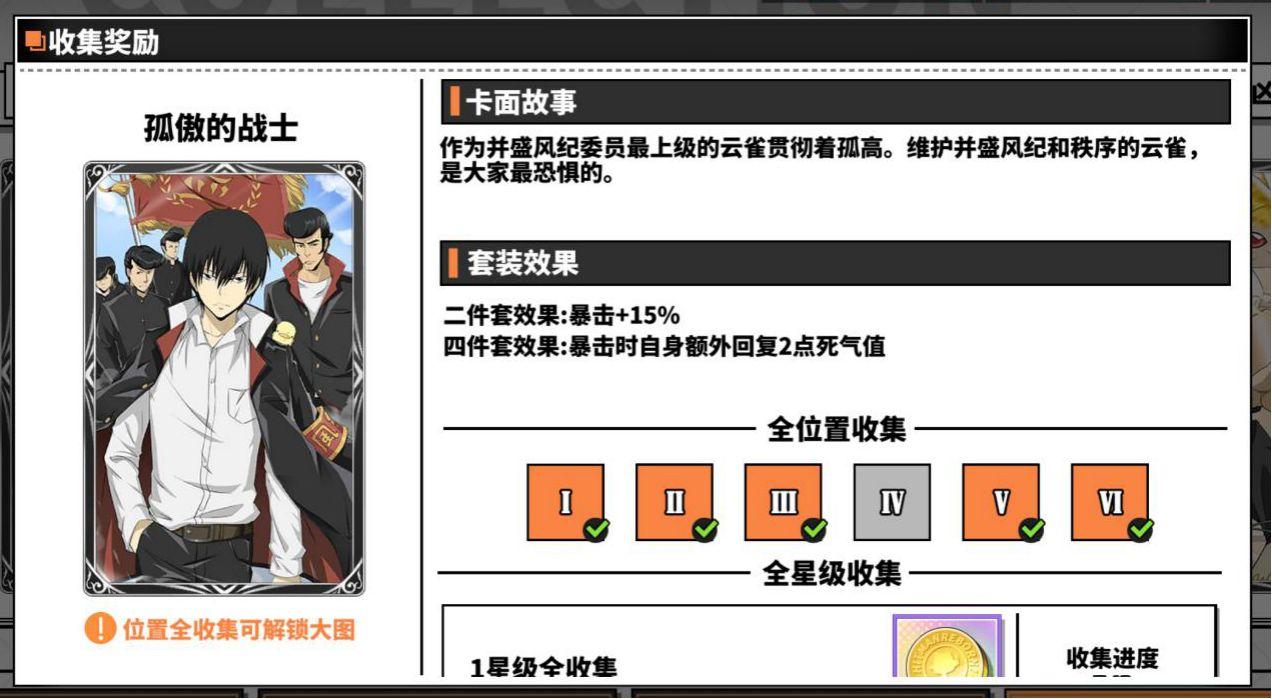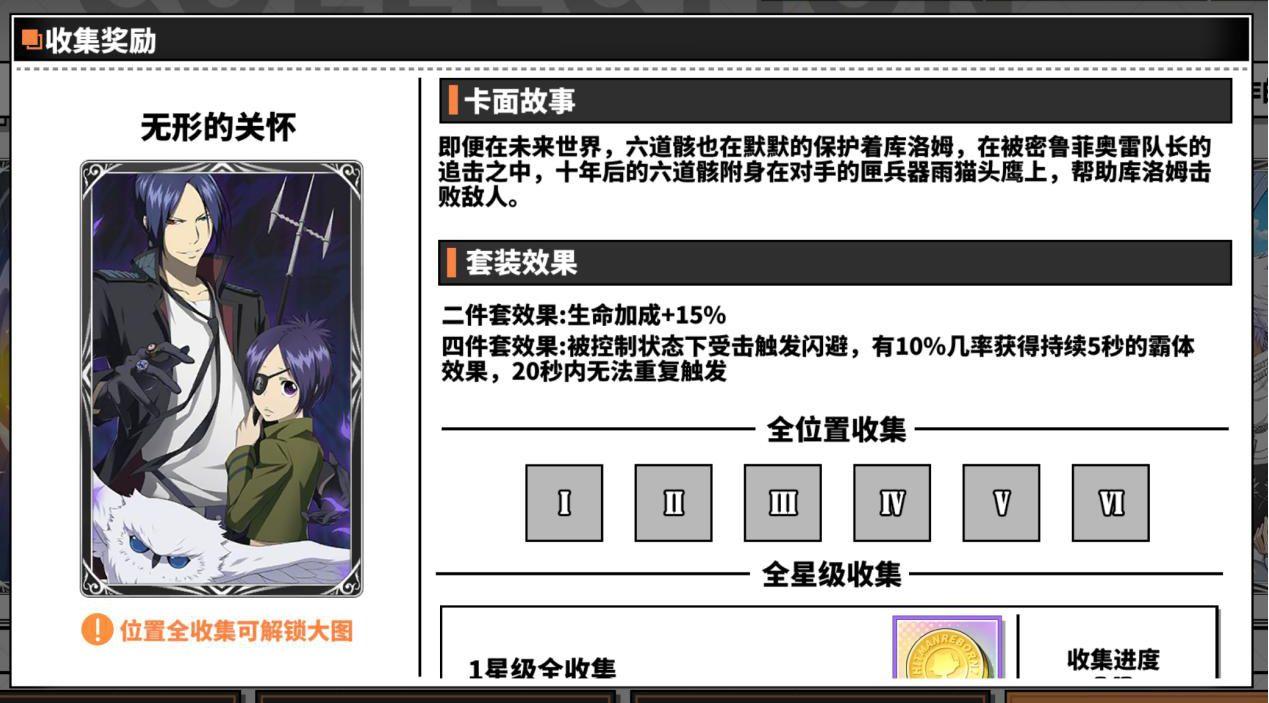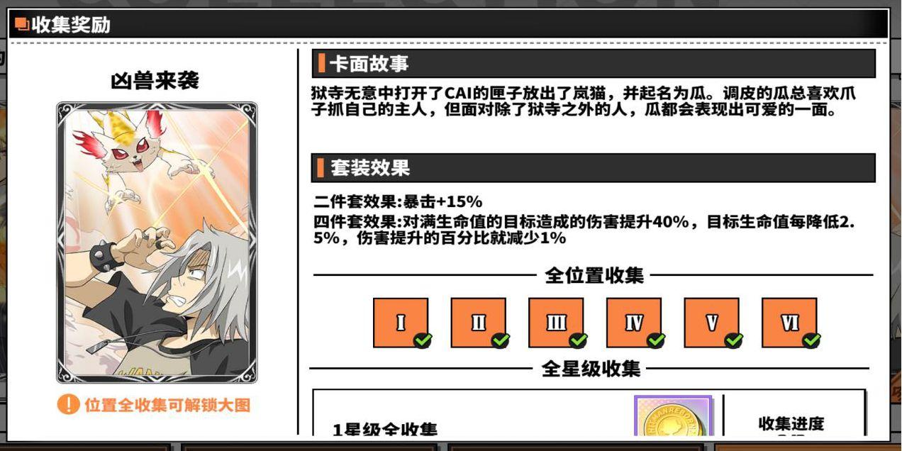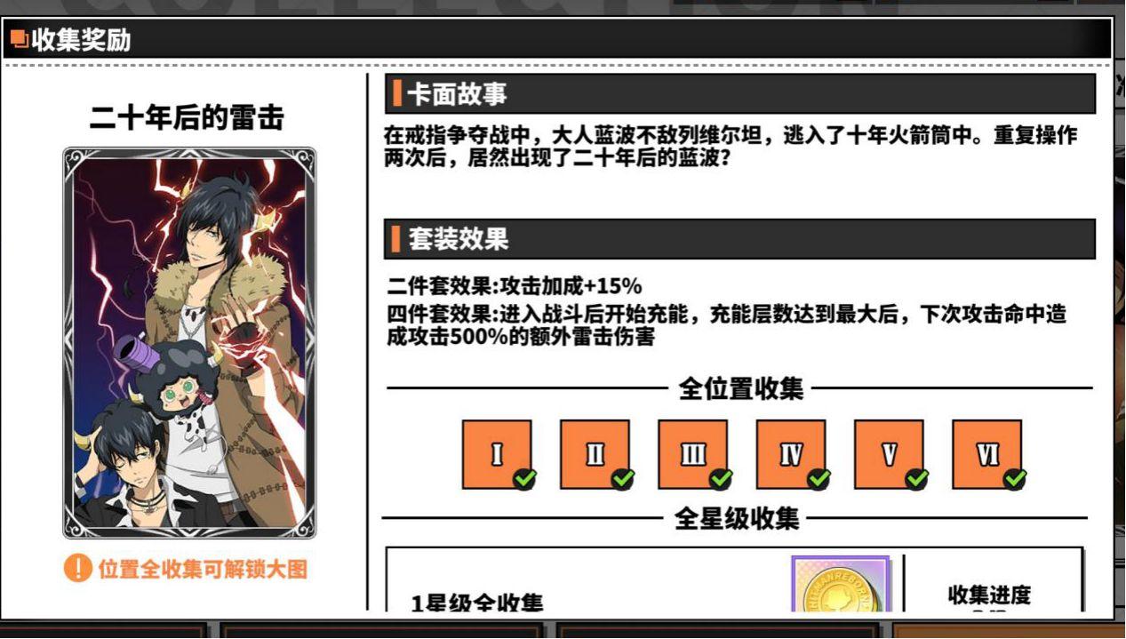 另外在成就任务中完成一定次数的究极模拟战和初级模拟战也可以领到卡片碎片或者卡片结晶,如果有拉尔?米尔齐、幻骑士、六道骸、云雀恭弥?戒指篇(需要五星),可以去卡片屋用卡片结晶换一套暗中较量(用来越级挑战斯帕纳初级模拟战,优先换一三五号位,二号位主属性需要为攻击,四号位需要为命中,六号位主属性需要暴击伤害,如果得不到四号位主属性为命中的辅助卡,可以借用库洛姆或者四星斯库瓦罗这两个角色做工具人,库洛姆带一套狡诈的主宰者配合十级戒指特性带一套暗中较量(副属性命中需要超过10%)的六道骸/拉尔?米尔齐和二星火焰装置,技术足够可以做到任意秒杀boss,尽早打通关初极模拟战,或者至少先打过第20层(第20层打败之后就可以在协同试炼爆出五星辅助卡,卡片屋也开始可以用金币购买五星辅助卡,从此走上肝卡赌卡买卡的不归路)。
