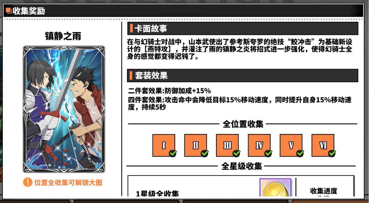 镇静之雨四件套效果为攻击敌方会对目标进行减速,同时给自己施加一个等量的加速,这套卡可以用于pvp风筝打法,适合普攻和技能的距离都比较远的角色,比如贝尔菲戈尔、拉尔?米尔齐,也可以给了平和XANXUS这种耐打角色使用,用来追人黏人。