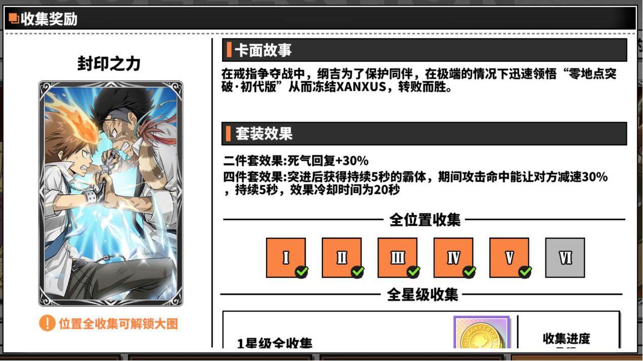 封印之力的四件套效果是在角色使用突进技能后获得一段时间霸体,期间攻击命中目标会使目标减速,这套卡适合有突进技能的角色,比如:云雀恭弥?戒指篇、XANXUS、泽田纲吉?戒指篇,这套卡适用于pvp,作用就是给自身加霸体状态来应对破招值比己方高的对手,借用短时间的爆发秒杀对方或者逼出对方的闪避。